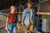 brodaty rolnik w słomkowym kapeluszu rozmawia z uśmiechniętą żoną układając hej w stodole