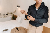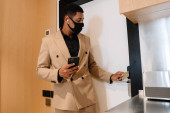 Czarny mężczyzna w szlafroku nakłada serum na twarz rano w łazience