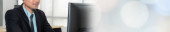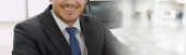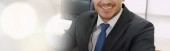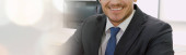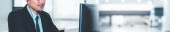Call center lub agent obsługi klienta w poszerzonym widoku panoramicznym baner noszenie słuchawki podczas pracy w biurze w celu wsparcia zdalnego klienta lub kolegi na telefon wideokonferencji połączenie