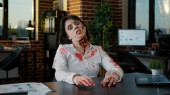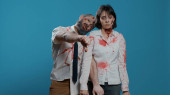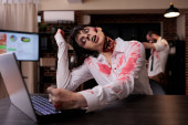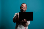 Bezmyślne zombie jedzące mózgi pracujące na laptopie i uśmiechające się przerażające przed kamerą. Niebezpieczne martwe mózgi potwór z głębokimi i krwawymi bliznami próbuje korzystać z komputera, ale zawodzi wielki czas.