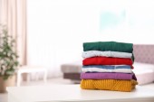 Kobieta składane ubrania przy drewnianym stole w pomieszczeniach, zbliżenie