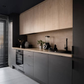 Ciemna i nowoczesna kuchnia z czarnymi meblami, drewnianymi detalami i lampami sufitowymi