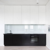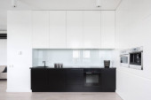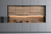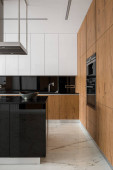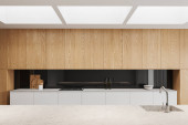 Zdjęcie "Ciemna i nowoczesna kuchnia z czarnymi meblami, drewnianymi detalami i lampami sufitowymi" może być wykorzystywane do celów osobistych i komercyjnych zgodnie z warunkami zakupionej licencji Royalty-free. Obraz jest dostępny do pobrania w jakości wysokiej rozdzielczości do 5760x3840.