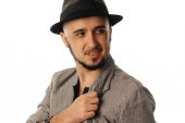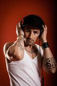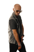 Seksualne nagi mężczyzna z broda i wąsy w czarną koszulę na b