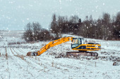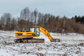 Zdjęcie "Mini koparka kopanie ziemi w polu lub lesie w pobliżu jezdni. Kopanie rowów dla gazociągu lub rurociągu naftowego.Wiosna, jesienne niebieskie tło nieba." może być wykorzystywane do celów osobistych i komercyjnych zgodnie z warunkami zakupionej licencji Royalty-free. Obraz jest dostępny do pobrania w jakości wysokiej rozdzielczości do 5760x3840.