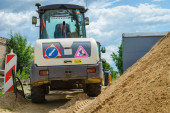 Mini koparka kopanie ziemi w polu lub lesie w pobliżu jezdni. Kopanie rowów dla gazociągu lub rurociągu naftowego.Wiosna, jesienne niebieskie tło nieba.