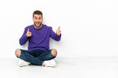 Młody człowiek siedzi na krześle na odizolowanym różowym tle myśląc o pomyśle wskazującym palcem w górę