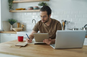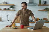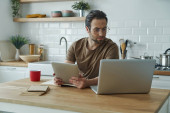 Wesoły młodzieniec korzystający z technologii podczas pracy na wyspie kuchennej w domu