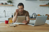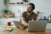 Zdjęcie "Wesoły młodzieniec korzystający z technologii podczas pracy na wyspie kuchennej w domu" może być wykorzystywane do celów osobistych i komercyjnych zgodnie z warunkami zakupionej licencji Royalty-free. Obraz jest dostępny do pobrania w jakości wysokiej rozdzielczości do 5760x3840.
