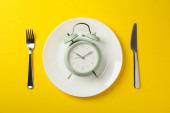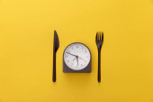 Budzik na białej tablicy z nożem i widelcem na niebieskim tle. Przerywany post, dieta ketogenna, utrata masy ciała, plan posiłków i koncepcja zdrowej żywności.