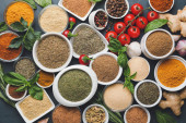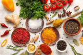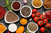 Zdjęcie "Skład z aromatycznymi przyprawami, warzywami i ziołami na ciemnym tle" może być wykorzystywane do celów osobistych i komercyjnych zgodnie z warunkami zakupionej licencji Royalty-free. Obraz jest dostępny do pobrania w jakości wysokiej rozdzielczości do 5760x3840.