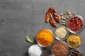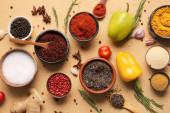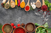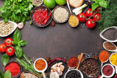 Skład z aromatycznymi przyprawami, warzywami i ziołami na ciemnym tle