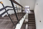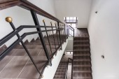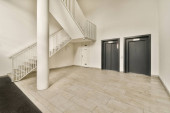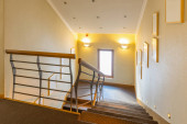 Przestronny, jasny korytarz z drewnianymi schodami i wejściem na strych z oknem