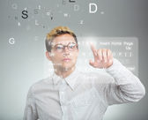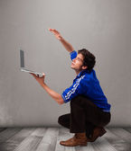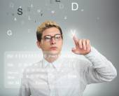 Atrakcyjny młody człowiek hoding notatnik z kolorowymi literami