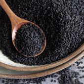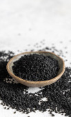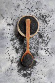 Indyjska przyprawa Nasiona czarnego kminku (nigella sativa lub kalonji) w misce z łyżką na szarym stole z bliska z przestrzenią do kopiowania. Medycyna tradycyjna, zdrowa i wegetariańska koncepcja żywności.