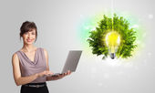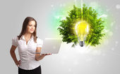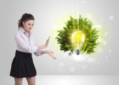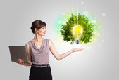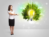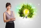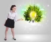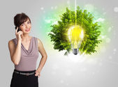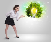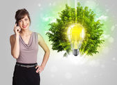 Młoda dziewczyna prezentuje żarówkę pomysł z zielonym drzewem