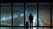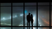 Mężczyzna i kobieta stojący w pobliżu panoramicznego okna przeciwko nocnemu miastu