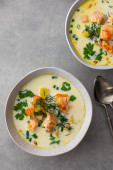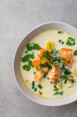 Norweski łosoś czerwona zupa rybna z warzywami, ziołami i śmietaną, widok z góry, zbliżenie