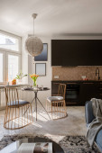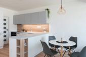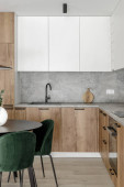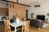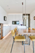 Zdjęcie "Prosty stół z drewnianymi krzesłami i dekoracjami obok nowoczesnej kuchni drewniane drzwi przesuwne" może być wykorzystywane do celów osobistych i komercyjnych zgodnie z warunkami zakupionej licencji Royalty-free. Obraz jest dostępny do pobrania w jakości wysokiej rozdzielczości do 5760x3840.
