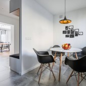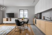 Prosty stół z drewnianymi krzesłami i dekoracjami obok nowoczesnej kuchni drewniane drzwi przesuwne