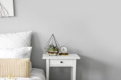 Stół ze świecącą lampą i wystrojem w pobliżu beżowej ściany w sypialni