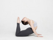 Piękna sportowa dziewczyna rozciągająca się na białym tle. Wysokiej jakości zdjęcie