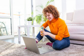 Zdjęcie "Słodkie rude włosy kobieta zakupy online z karty kredytowej. Kobieta trzymająca kartę kredytową i używająca laptopa. Koncepcja zakupów online" może być wykorzystywane do celów osobistych i komercyjnych zgodnie z warunkami zakupionej licencji Royalty-free. Obraz jest dostępny do pobrania w jakości wysokiej rozdzielczości do 5760x3840.
