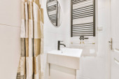 Zdjęcie "Nowoczesna toaleta spłukiwana i zlewozmywak ceramiczny zamontowane na białych ścianach płytek w pobliżu lustra i ręcznik w małej toalecie w domu" może być wykorzystywane do celów osobistych i komercyjnych zgodnie z warunkami zakupionej licencji Royalty-free. Obraz jest dostępny do pobrania w jakości wysokiej rozdzielczości do 5760x3840.