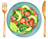 Zdjęcie "Sałatka z truskawkami, szpinakiem i orzechami włoskimi na talerzu. Koncepcje zdrowej żywności. Widok góry. Ilustracja akwareli. Nadaje się do menu i książki kucharskiej. " może być wykorzystywane do celów osobistych i komercyjnych zgodnie z warunkami zakupionej licencji Royalty-free. Obraz jest dostępny do pobrania w jakości wysokiej rozdzielczości do 5760x3840.