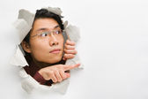 Azjatycki biznesmen szok zaglądając za pusty transparent