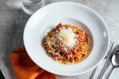 makaron z sosem pomidorowym domowej roboty, selektywna focu