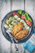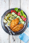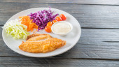 Kotlet wieprzowy panierowany pokryty okruchami chleba z ziemniakami i sałatkami warzywnymi