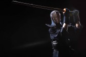 Afrykański amerykański bandyta z maską na twarzy trzymający kij baseballowy w pobliżu graffiti w garażu z dymem, sztandar