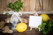 Zdjęcie "Mennica w szkło wazon, cytryny i mini Sztaluga z pustym płótnie" może być wykorzystywane do celów osobistych i komercyjnych zgodnie z warunkami zakupionej licencji Royalty-free. Obraz jest dostępny do pobrania w jakości wysokiej rozdzielczości do 5760x3840.