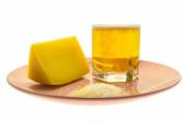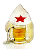 Kubek z piwem i ryb na talerz i czepka z czerwonym sta