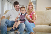 Szczęśliwe młode rodziny w domu z komputera typu tablet