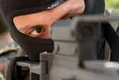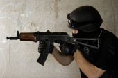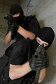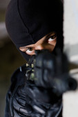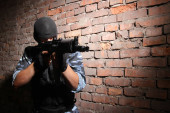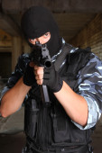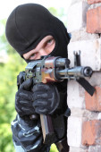 żołnierz w czarna maska kierowania z ak-47 karabin