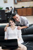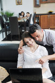 Szczęśliwa młoda para bawić się w nowoczesnej kuchni