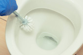 dziewczyna w rękawiczkach czyści ceramiczną toaletę szczotką do dezynfekcji i czystości