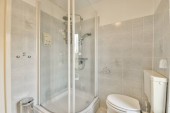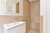 Zdjęcie "Wnętrze wąskiej umywalni ze szklaną ścianą w pobliżu sypialni w nowoczesnym apartamencie" może być wykorzystywane do celów osobistych i komercyjnych zgodnie z warunkami zakupionej licencji Royalty-free. Obraz jest dostępny do pobrania w jakości wysokiej rozdzielczości do 5760x3840.