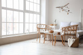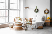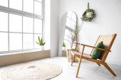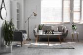 Zdjęcie "Wygodny fotel z lampami i roślinami w pobliżu ściany światła w pokoju" może być wykorzystywane do celów osobistych i komercyjnych zgodnie z warunkami zakupionej licencji Royalty-free. Obraz jest dostępny do pobrania w jakości wysokiej rozdzielczości do 5760x3840.