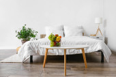 Wygodny fotel z lampami i roślinami w pobliżu ściany światła w pokoju