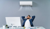 Happy Young Businesswoman pracuje w biurze z klimatyzacją