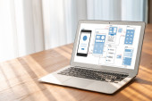 Zdjęcie "Oprogramowanie do projektowania stron internetowych zapewnia modish szablon dla handlu detalicznego online i e-commerce" może być wykorzystywane do celów osobistych i komercyjnych zgodnie z warunkami zakupionej licencji Royalty-free. Obraz jest dostępny do pobrania w jakości wysokiej rozdzielczości do 5760x3840.