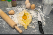 Zdjęcie "Profesjonalny piekarz, który przygotowuje ciasto z jaj, oleju i mleka na Boże Narodzenie ciasteczka. Koncepcja pysznego pieczenia w domu" może być wykorzystywane do celów osobistych i komercyjnych zgodnie z warunkami zakupionej licencji Royalty-free. Obraz jest dostępny do pobrania w jakości wysokiej rozdzielczości do 5760x3840.