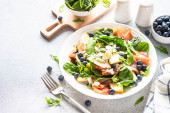 Zdrowa sałatka ze szpinakiem, rukolą, jamonem, gruszką, jagodami i parmezanem na białym tle.