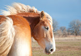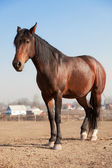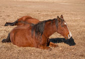 ciemny Zatoka konia w jego płaszcz zimowy drzemał południe