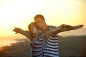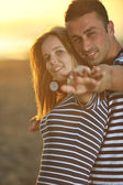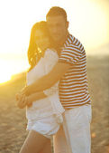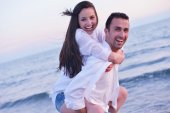 szczęśliwy młody para mieć romantyczny czas na plaży