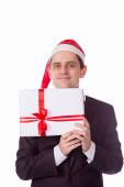 człowiek w garniturze i kapeluszu z Boże Narodzenie prezent ręcznie na biały backgro