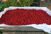 Saskatoon, service berry basket harvest, market fresh on wood, outdoors in dappled sunshine